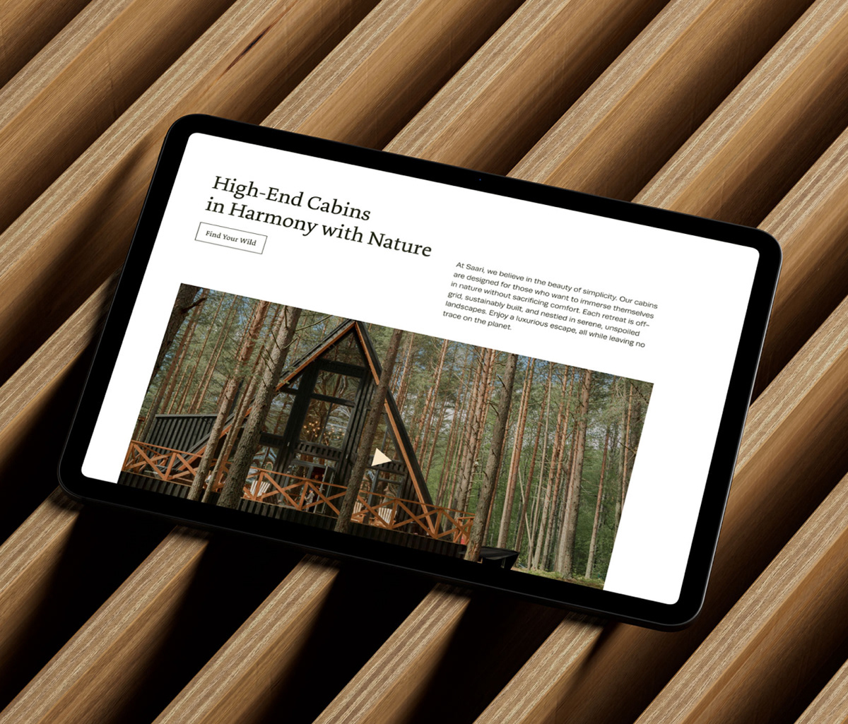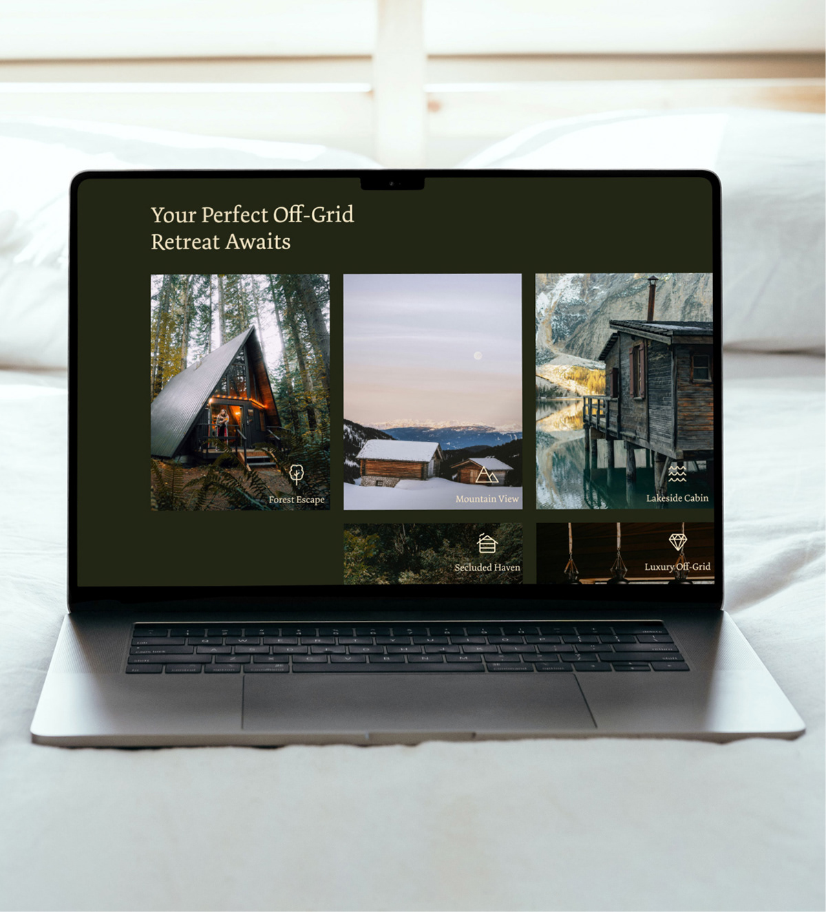 The website extends this sense of calm through a neutral palette of deep greens and soft beige, allowing the cabin imagery to breathe. Clear, intuitive navigation ensures every visitor’s journey feels effortless, from exploration to booking.